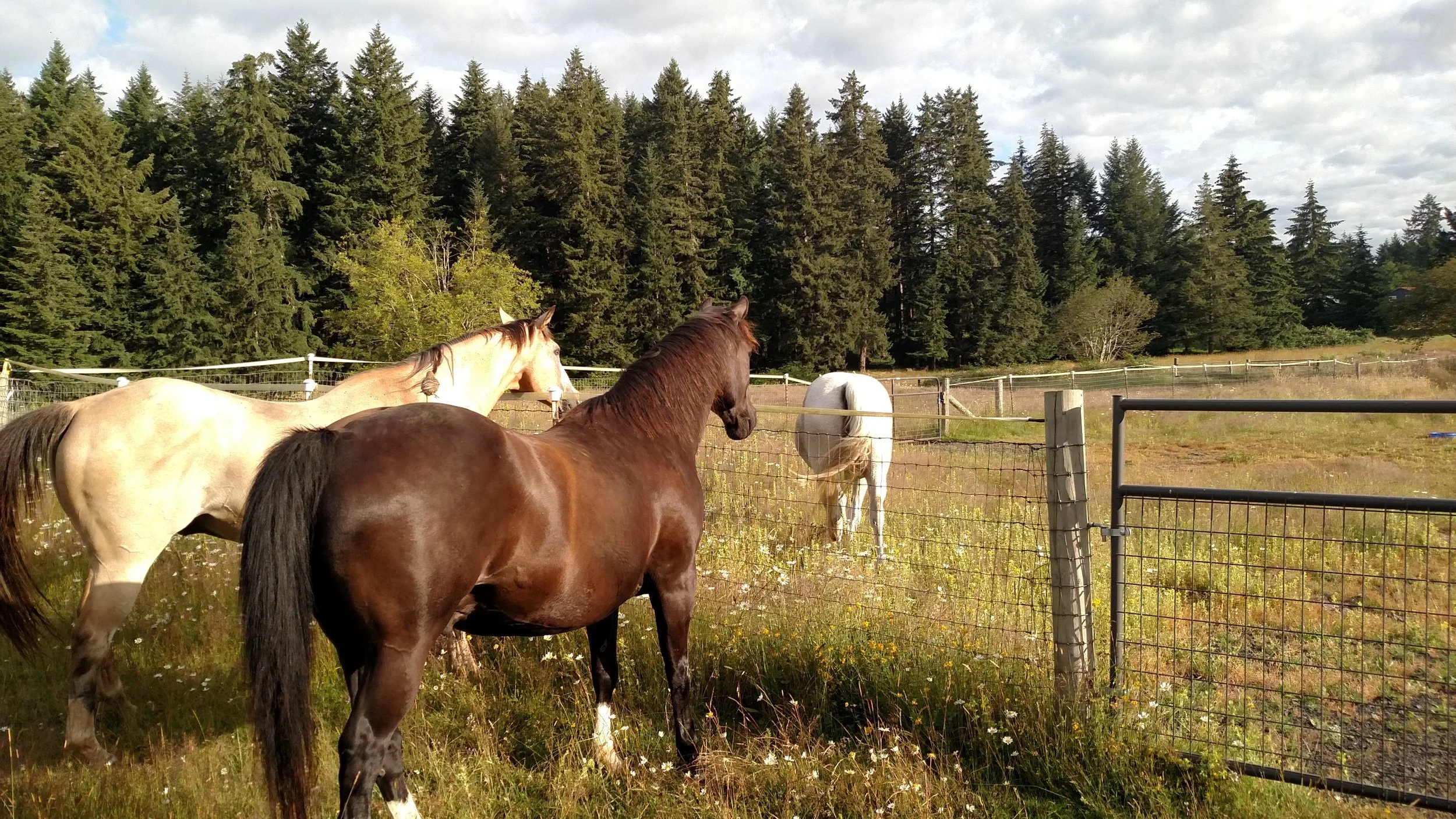 We currently have eight rescue horses, and two boarding horses, and each has their own special story. Sundance was a trail horse in Yellowstone National Park, but got to be too old to play that role. He was sent to the kill pen, and in the holding area for that place, he met Shadow. Shadow was a brood mare, kept in a small stall all the time and kept constantly pregnant. They were both rescued by another horse rescue organization, moved to a recovery facility for a year, at some point they were separated, and then later they were separately and on different schedules, sent to the Farm. They were delighted to once again recognize each other at the Farm, and now can be seen grazing together and running long distances together in the central-south pasture.